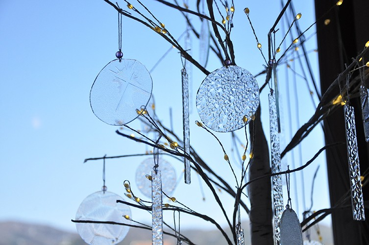 店内には、型板ガラスを使ったオーナメントやアクセサリーが並びます。特に人気なのが「ゆらゆらオーナメント」。割れたガラスのかけらを糸で吊るし、風に揺れてシャラシャラと涼し気な音を奏でます。