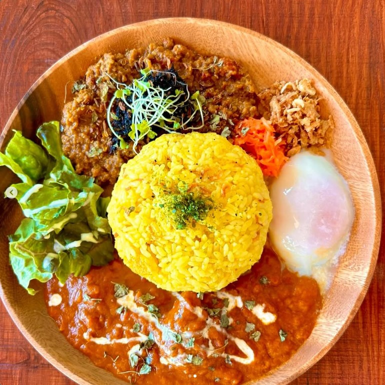 - メニュー例:合い盛りカレー、海鮮丼、島野菜の小鉢など